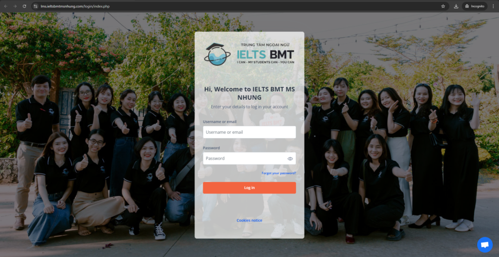 Bước 1. Truy cập địa chỉ https://ieltsbmtmsnhung.edu.vn nhấn Đăng nhập LMS Bước 2. Nhập tên người dùng và mật khẩu được cung cấp để truy cập hệ thống quản lý học tập