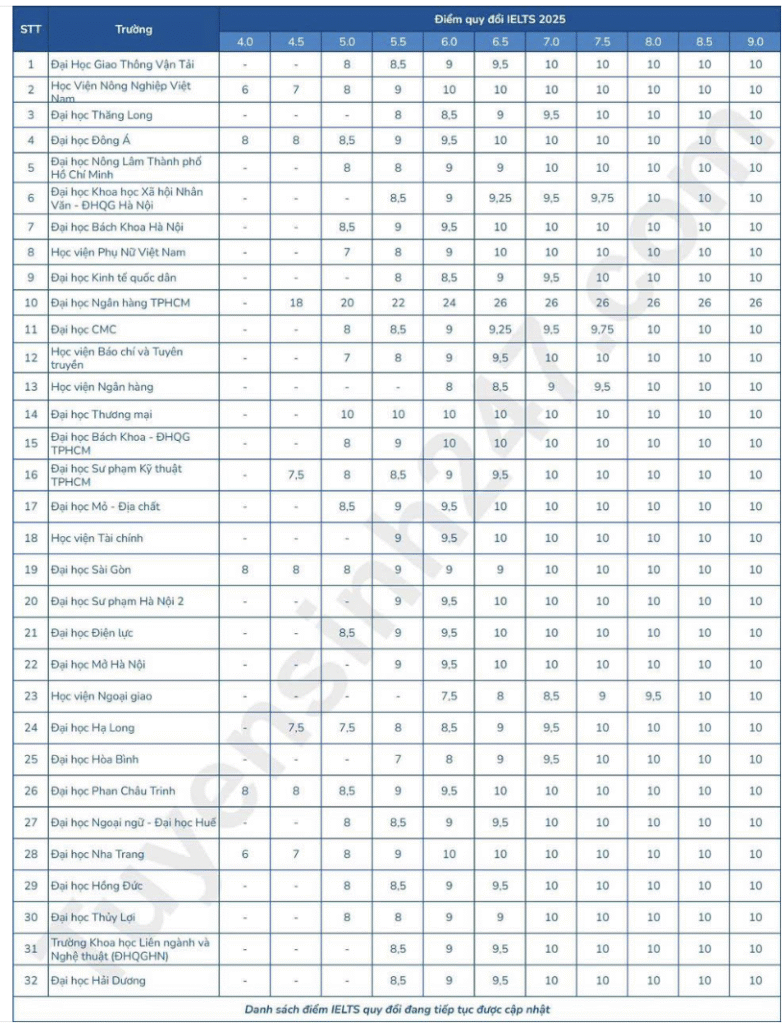 Danh sách các trường đại học công bố đổi điểm IELTS năm 2025. Ngoài việc được miễn thi môn tiếng Anh tốt nghiệp THPT, thí sinh có bằng IELTS còn có thể được các trường Đại học quy đổi điểm và cộng điểm ưu tiên khi xét tuyển. Cụ thể: Điểm quy đổi IELTS không […]