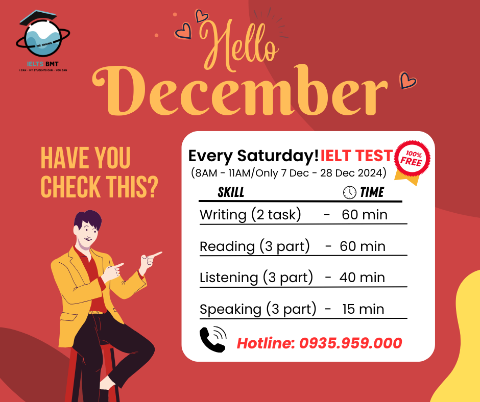 Một năm 2024 sắp khép lại, bạn đã sẵn sàng cho hành trình chinh phục IELTS trong năm 2025 chưa? Hãy bắt đầu bằng bài test trình độ miễn phí duy nhất có tại IELTS BMT! Thời gian: 8:00 – 11:00 sáng thứ 7 hàng tuần Chương trình áp dụng: Từ 7/12 đến 28/12/2024 Chi […]