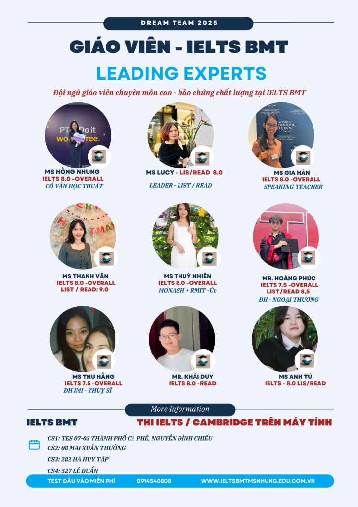 Tại IELTS BMT, chúng tôi tin rằng chất lượng giảng dạy bắt nguồn từ con người. Core Team của IELTS BMT không chỉ sở hữu điểm số IELTS ấn tượng, mà còn có nền tảng học thuật vững chắc, kinh nghiệm giảng dạy lâu năm và đặc biệt là sự thấu hiểu người học Việt Nam.