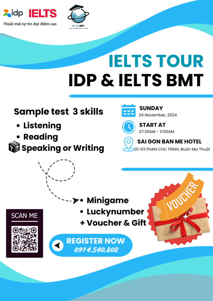 IELTS TOUR là sự kiện thường niên do IDP và IELTS BMT phối hợp tổ chức, là dịp lý tưởng để bạn cập nhật kiến thức, kinh nghiệm khi đi thi và trải nghiệm thi thử 3 kỹ năng (Listening, Reading, và Speaking/Writing) chuẩn IDP