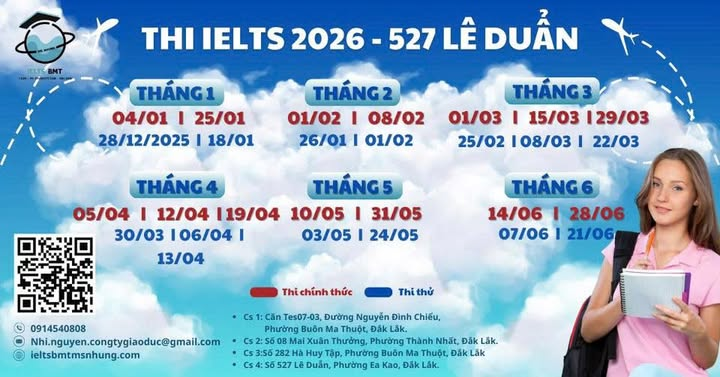 IELTS BMT trân trọng thông báo lịch thi IELTS chính thức và thi thử trong 6 tháng đầu năm 2026 tại cơ sở 527 Lê Duẩn, TP. Buôn Ma Thuột. Thí sinh có thể chủ động lựa chọn thời gian phù hợp để đăng ký dự thi và chuẩn bị kế hoạch ôn luyện hiệu quả.