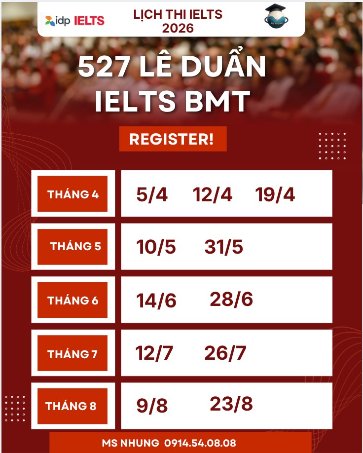 📢 THÔNG BÁO LỊCH THI IELTS 6 THÁNG ĐẦU NĂM 2026Tại IELTS BMT – 527 Lê Duẩn IELTS BMT trân trọng thông báo lịch thi IELTS chính thức và thi thử trong 6 tháng đầu năm 2026 tại cơ sở 527 Lê Duẩn, TP. Buôn Ma Thuột. Thí sinh có thể chủ động lựa chọn […]